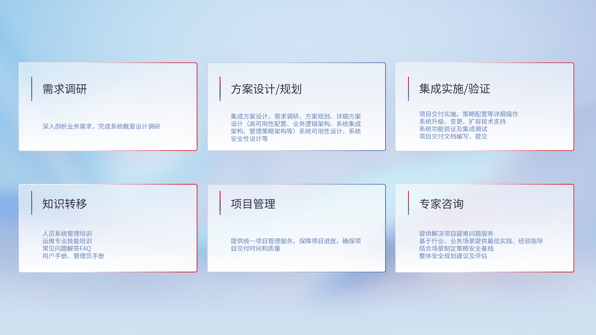 针对客户行业特性,,,将宏观的安全战略和需求,,,,通过专业的交付服务,,实现项目落地,,,为客户提供标准规范的集成交付服务。。。